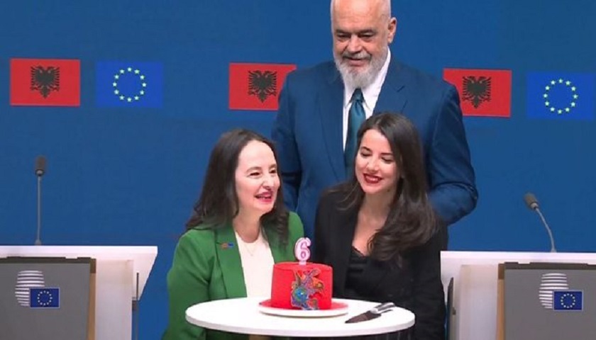 Kryeministri shqiptar Edi Rama, Komisionerja për zgjerimin, Marta Kos dhe Ministrja daneze e Punëve të Jashtme, Marie Bjerre festuan hapjen e grupkapitullit të fundit në konferencën e 7-të ndërqeveritare në Bruksel. Komisionerja për Zgjerimin Marta Kos solli një tortë, ku sipër qëndronte një qiri me numrin 6.